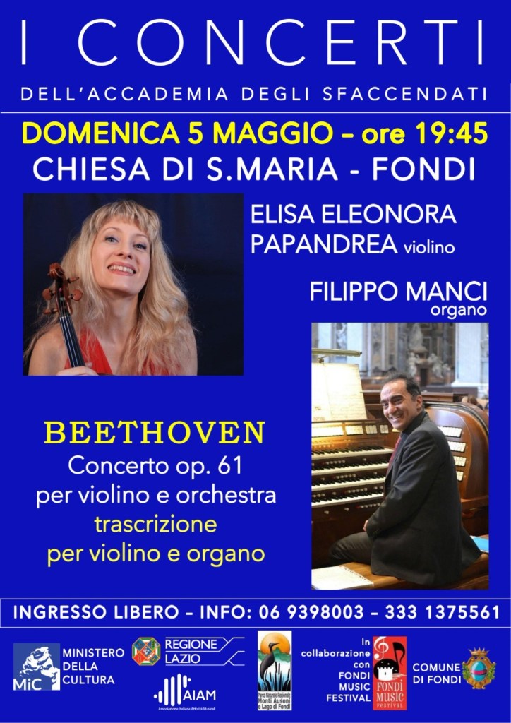 Il primo appuntamento si terrà presso la Chiesa di Santa Maria, grazie all’ospitalità del Parroco Don Sandro Guerriero appassionato cultore di Musica, e vedrà impegnati due concertisti di vaglia – la violinista Elisa Eleonora Papandrea e l’organista Filippo Manci -che faranno ascoltare due capolavori beethoveniani in una veste particolare: la trascrizione per organo della partitura sinfonica del Concerto per violino e orchestra in re maggiore op.61 (ad opera dello stesso Filippo Manci) e la trascrizione per organo ottocentesca del primo movimento della Quinta Sinfonia in do minore op.67.