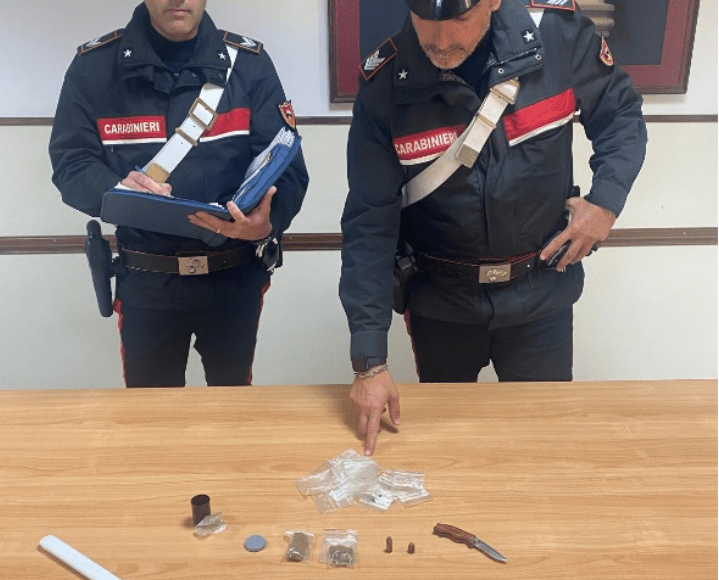 Il ragazzo, durante un controllo, è stato sorpreso inizialmente con una bustina in cellophane intrisa di sostanza stupefacente e successivamente, a seguito di perquisizione domiciliare, veniva rinvenuto in possesso di 2 involucri contenente hashish rispettivamente di grammi venti circa oltre ad un coltello a serramanico ed un proiettile calibro 9 e 1 ogiva.