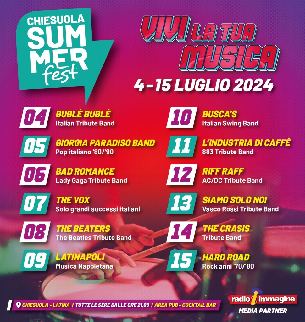 Sta per prendere il via la seconda edizione del Chiesuola Summer Fest, la rassegna dedicata alle migliori tribute band di Latina e provincia destinata a far vibrare l’anima musicale che alberga in ognuno di noi. Dal 4 al 15 luglio, sono in programma dodici concerti live ad ingresso gratuito, che spazieranno dal rock al pop, dallo swing al cantautorato italiano, con una incursione nella canzone classica e popolare napoletana.