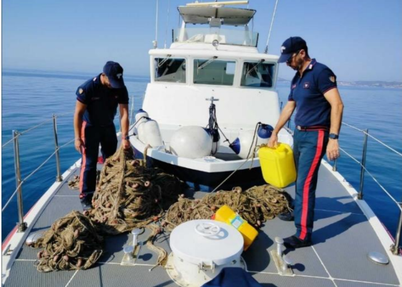 Nella medesima circostanza i militari della dipendente Motovedetta CC 816 dell’Arma dei Carabinieri di Gaeta, nel perlustrare gli specchi d’acqua attigui alla costa della giurisdizione nel comune di Formia, prospicente al litorale di Gianola ed a circa 0,5 miglia dalla costa, hanno portato alla luce un’attività illegale e dannosa per l’ambiente marino quale la pesca di frodo con l’utilizzo di trappole artigianali e reti da pesca immerse in modo del tutto illecito. Il personale dell’Arma, durante il controllo svolto in mare aperto, è infatti incorso in una tanica in plastica di colore giallo da 25 litri, fungente da galleggiante e segnale, al quale era legata una cima che scendeva sul fondo e che collegava circa 900 metri di rete da posta, unita all’altra estremità da un’ulteriore tanica vuota.