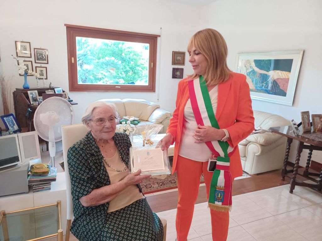 Il sindaco Matilde Celentano, ieri pomeriggio, ha reso omaggio alla cittadina di Latina Maria Pontesilli per il suo centesimo compleanno facendole visita durante la festa organizzata nella sua abitazione lungo l’Appia.