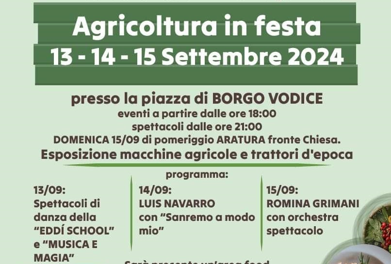 Un fine settimana che si preannuncia ricco di emozioni, sapori e tradizione a Borgo Vodice, dove i prossimi 13, 14 e 15 settembre andrà in scena “Agricoltura in festa”. Un evento che celebra le radici contadine della comunità locale, organizzato dal settore Attività produttive del Comune di Sabaudia, in collaborazione con la Camera di Commercio di Latina-Frosinone e diverse realtà del territorio, tra cui le Officine della memoria, l’Asd Sabaudia 2010, il Comitato 90esimo Borgo Vodice, Eddì School e Musica e Magia.
