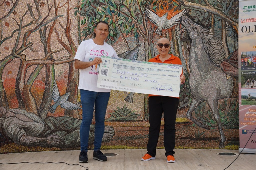 Proprio all’Andos di Fondi è stato destinato il ricavato della manifestazione: il presidente Stefano Prota ha esibito infatti un simbolico maxi assegno di 2mila euro da destinare all’associazione per sostenerla nella lotta contro il tumore alla mammella.