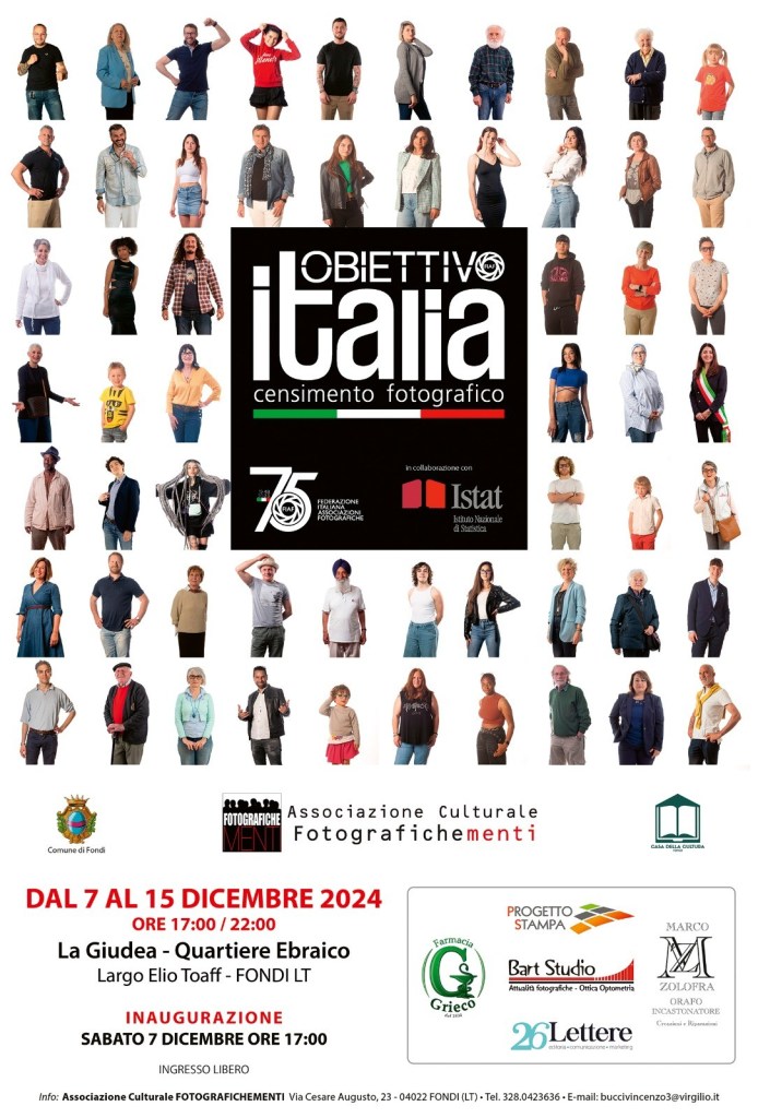 Dopo il progetto collettivo nazionale “Obiettivo Italia – censimento fotografico” che si è svolto nel mese di maggio 2023 e che ha visto la partecipazione di ben 150 circoli dislocati in tutto il territorio nazionale, l’associazione FotograficheMenti organizza un’esposizione di tutti gli scatti raccolti a Fondi.