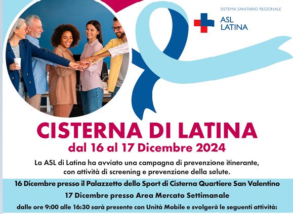Due giornate di screening e prevenzione sono in programma lunedì 16 e martedì 17 dicembre a Cisterna. La ASL di Latina, infatti, in collaborazione con il Comune di Cisterna, ha predisposto la “Compagnia itinerante della Salute”, una Unità Mobile che farà tappa lunedì dalle 9 alle 16:30 presso il Palazzetto dello Sport di San Valentino in viale Adriatico, e martedì presso l’Area Mercato in via delle Province.