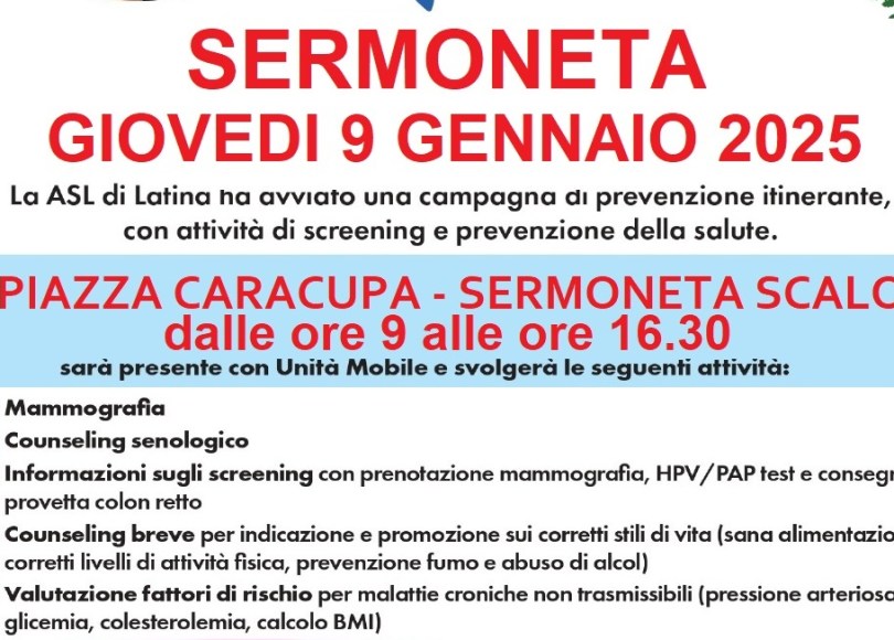 Il dipartimento di prevenzione della Asl di Latina, in collaborazione con l’amministrazione comunale di Sermoneta, ha organizzato una giornata di screening oncologici gratuiti per le cittadine e i cittadini di Sermoneta.