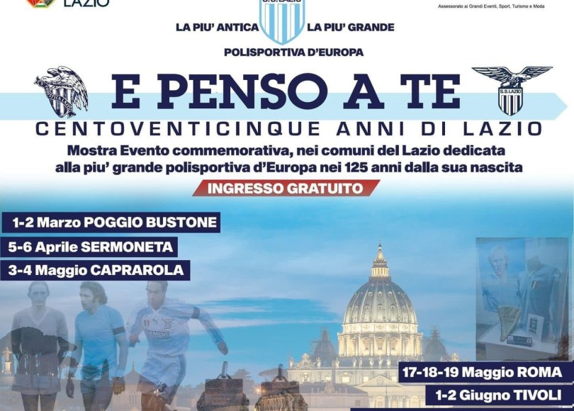 Sermoneta protagonista della mostra-evento itinerante “E penso a te…” , organizzata in occasione del 125° anniversario della S.S. Lazio. L’iniziativa attraverserà alcuni dei luoghi più significativi della regione Lazio, tra cui Poggio Bustone, Caprarola, Roma, Tivoli, Vico nel Lazio e, appunto, Sermoneta, con l’obiettivo di raccontare e valorizzare un importante patrimonio sportivo.