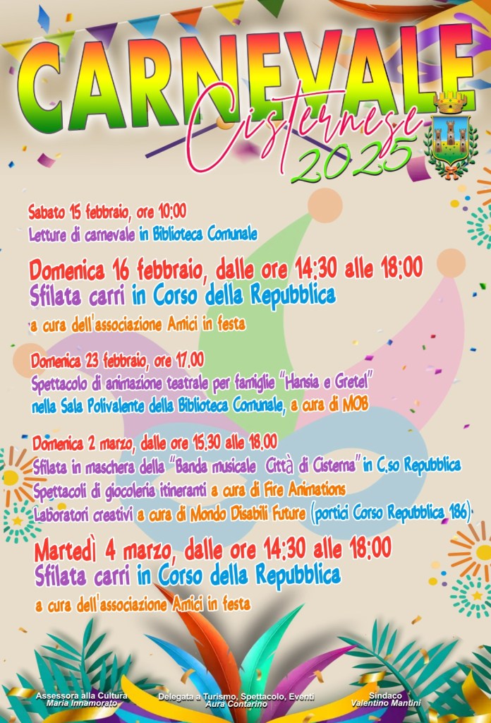 E’ stato ultimato il programma degli eventi del “Carnevale Cisternese 2025”: il cartellone è ricco di appuntamenti che prenderanno il via il 15 febbraio per concludersi martedì 4 marzo.