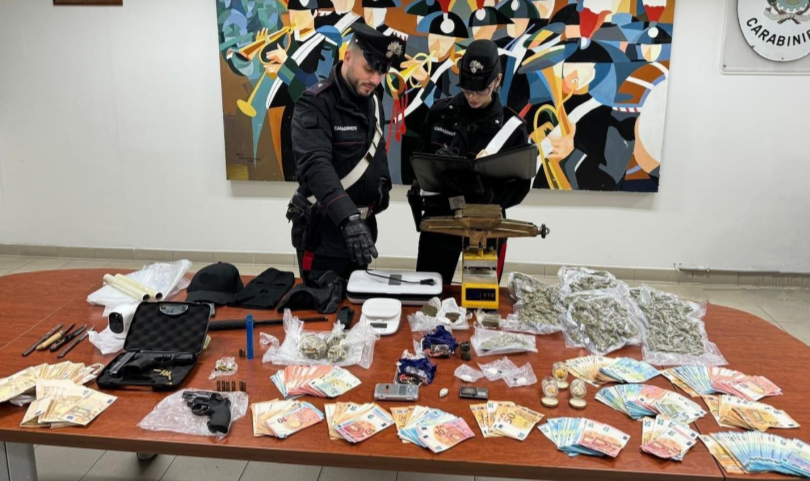 Nello specifico i carabinieri, hanno proceduto ad un controllo presso un locale del posto in uso ai due uomini, rinvenendo armi, denaro contante, banconote contraffatte, armi da fuoco, munizionamento, sostanza stupefacente di vario tipo e materiale per il confezionamento, ritenuti provento di attività illecita.