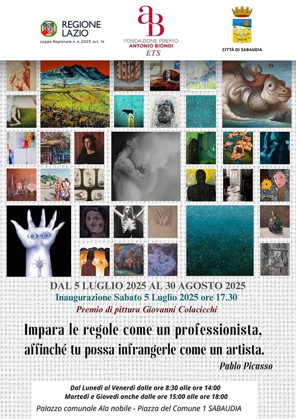 Si svolgerà domani, domenica 6 luglio, alle 17:30 presso il palazzo municipale di Sabaudia, l’inaugurazione della mostra collettiva d’arte contemporanea frutto del Premio Antonio Biondi, organizzato dall’omonima Fondazione con la collaborazione determinante della Regione Lazio e del Comune di Sabaudia.