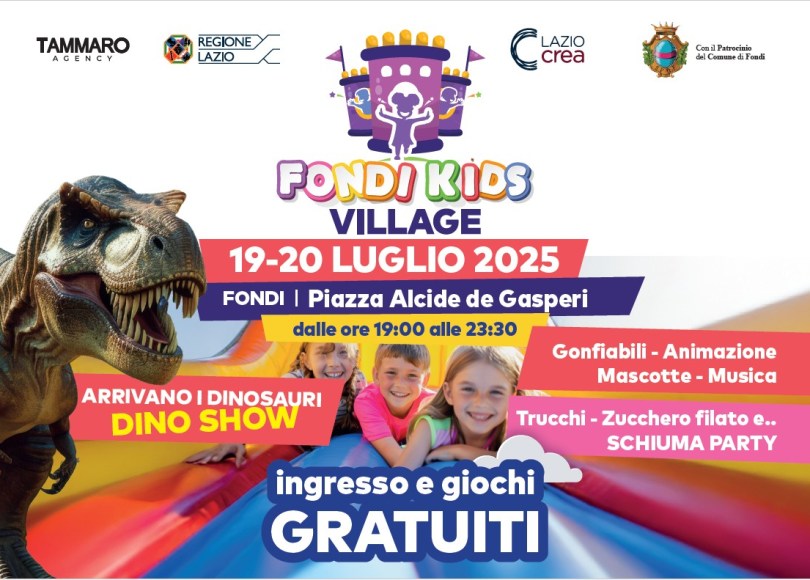 Il Fondi Kids Village è un evento promosso dal Comune di Fondi nell’ambito del cartellone “Estatissima 2025”, organizzato dalla Tammaro Agency con il patrocinio del Comune di Fondi e della Regione Lazio e il supporto di Lazio Crea.