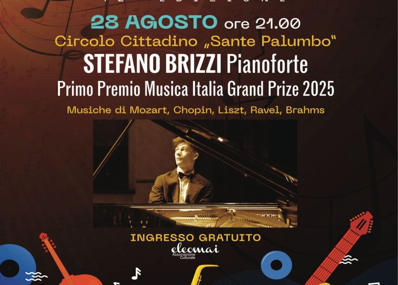 Giovedì 28 agosto, alle ore 21, si terrà l’ultimo appuntamento con I Salotti Musicali 2025 organizzati dall’Associazione Culturale Eleomai in collaborazione e con il patrocinio del Comune di Latina e Opes Latina. L’evento rientra nel calendario di appuntamenti estivi della rassegna del Comune “Latina estate 2025”. Ad esibirsi al Circolo cittadino Latina – Sante Palumbo sarà il giovane pianista Stefano Brizzi, Primo Premio al Musica Italia Grand Prize 2025. L’evento è ad ingresso gratuito. In programma W. A. Mozart: Sonata n. 12 in Fa Maggiore, K. 332; F. Chopin: Scherzo n. 3, Op. 39; F. Liszt: Rapsodia Ungherese n. 12; M. Ravel: Valses nobles et sentimentales; J. Brahms: Variazioni su un Tema di Paganini, Op. 35 (I libro).