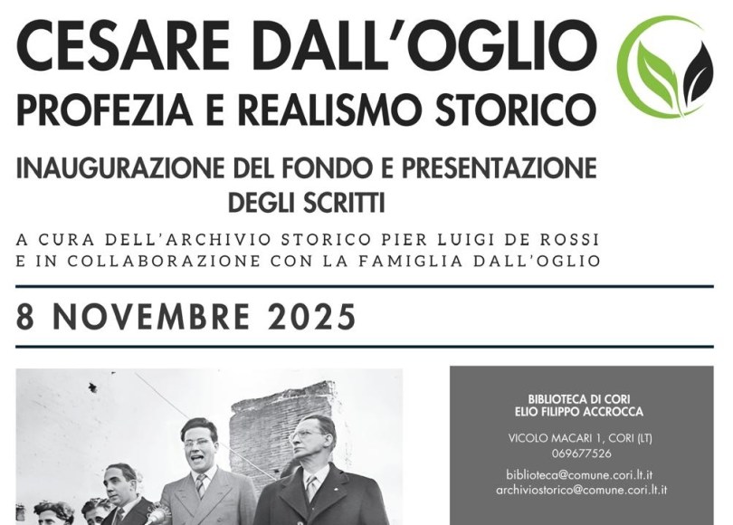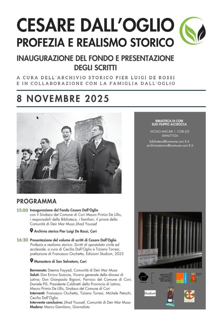 Sabato 8 novembre, a partire dalle ore 15, la biblioteca ‘Elio Filippo Accrocca’ e l’Archivio storico di Cori ospiteranno un evento dedicato a Cesare Dall’Oglio, figura del cattolicesimo impegnato del Novecento. Si inizierà con l’inaugurazione del suo fondo librario: la famiglia ha deciso di condividere con la comunità i volumi, unitamente alle carte private, alle riviste e alle pubblicazioni, che hanno accompagnato la vita e il lavoro di Dall’Oglio, permettendo così di accedere a un prezioso patrimonio di studio, riflessione e memoria.