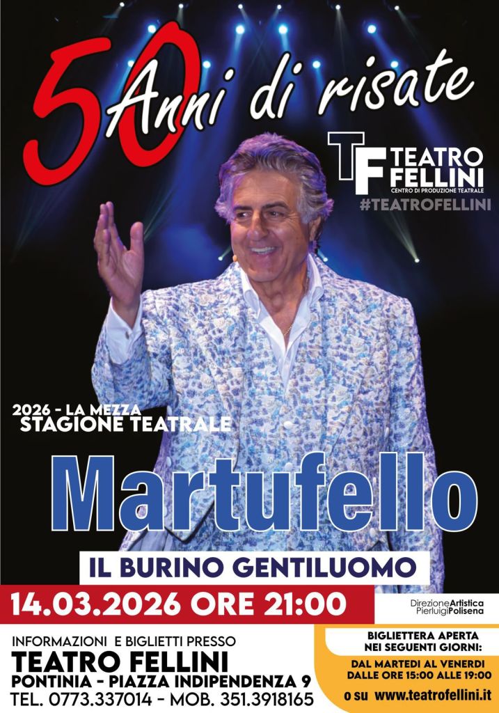 Sabato 14 marzo alle ore 21.00 terzo appuntamento della stagione al Teatro Fellini di Pontinia. Il pubblico potrà assistere a “Il Burino Gentiluomo”, lo spettacolo scritto e diretto da Pierfrancesco Pingitore e interpretato da Martufello, protagonista di una serata all’insegna dell’ironia e del racconto di costume. Con questo spettacolo Martufello porta in scena una nuova tappa del suo percorso artistico.