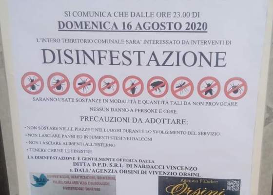 Nella serata di domenica 16 agosto verrà effettuata la disinfestazione di zanzare e altri insetti. Si raccomanda di chiudere porte