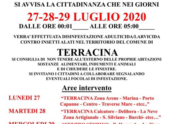Si avvisa la cittadinanza che nei giorni 27, 28 e 29 luglio 2020, dalle ore 00:01 alle ore 05:00, verrà