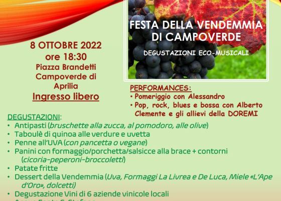 Sabato 8 ottobre in piazza Brandetti, a Campoverde di Aprilia, a partire dalle 18:30, si svolgerà la Festa della vendemmia,