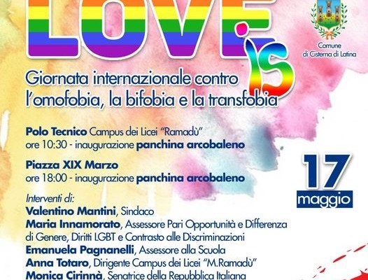 Domani, martedì 17 maggio, in occasione della Giornata internazionale contro l’omofobia, la bifobia e la transfobia, l’Amministrazione Comunale di Cisterna