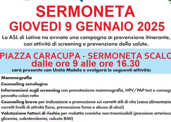 Sermoneta: Giovedì 9 gennaio screening gratuiti nel poliambulatorio mobile in Piazza Caracupa